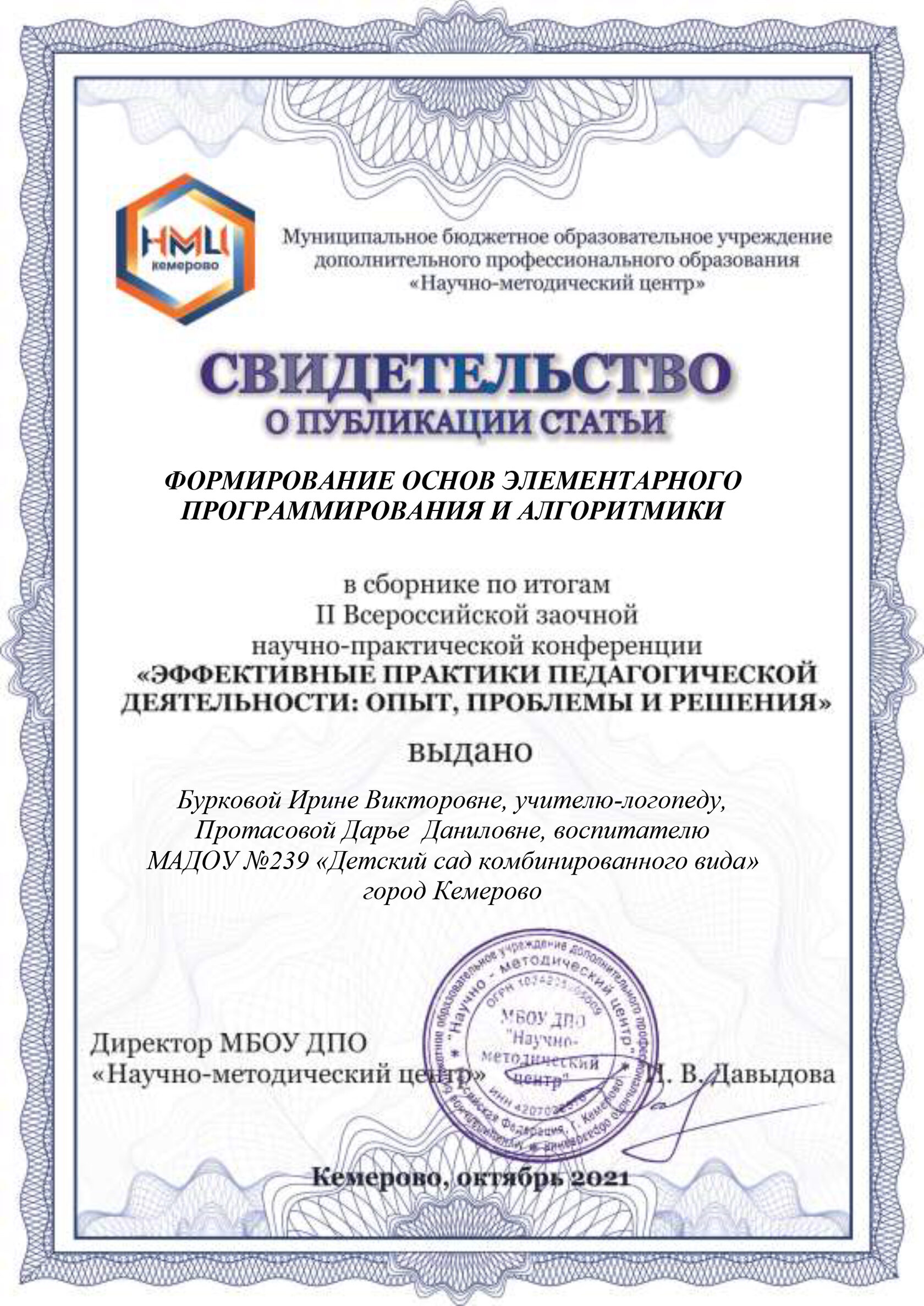 ФОРМИРОВАНИЕ ОСНОВ ЭЛЕМЕНТАРНОГО ПРОГРАММИРОВАНИЯ И АЛГОРИТМИКИ. В сборнике по итогам II Всероссийской заочной научно-практической конференции «Эффективные практики педагогической деятельности: опыт, проблемы и решения», октябрь, 2021