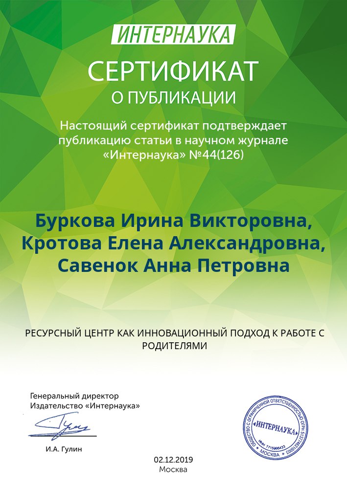 РЕСУРСНЫЙ ЦЕНТР КАК ИННОВАЦИОННЫЙ ПОДХОД К РАБОТЕ С РОДИТЕЛЯМИ. Изд. «Интернаука», декабрь 2019.